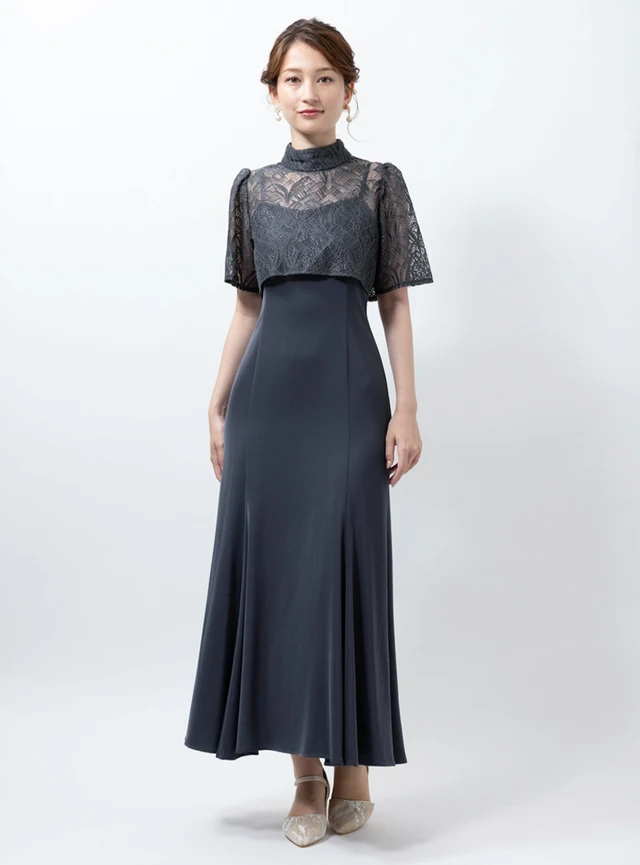 繊細なレース素材のショートボレロと、曲線を描くマーメイドシルエットのワンピースがセットになった3wayドレスです。ボレロは着脱や着用方法を変えることで印象が変わり、シーンや好みに合わせたスタイリングが楽しめます。バックスタイルにはピンタックを施し、後ろ姿まで抜かりのないデザインに。ワンピースの肩紐はアジャスター付きで、体型や着丈に合わせて調整可能です