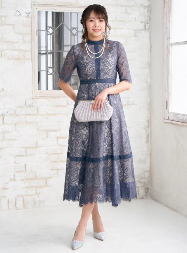 繊細なレース素材を贅沢に使用した、上品な雰囲気のワンピースです。配色を効かせた切り替えデザインが全体にメリハリを与え、首元やウエストラインをきれいに見せてくれるのがポイント。程よくフィットするゴム仕様のウエストで、見た目のきちんと感と着心地の良さを両立しています。袖付きデザインのため露出を抑えたい方にもおすすめの一着です。