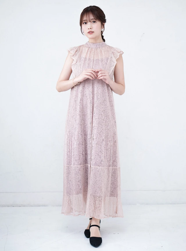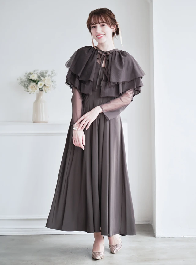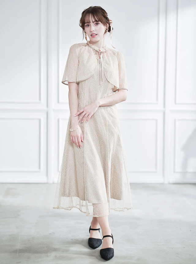 繊細なレース素材にゴールド刺繍をあしらった、上品さと可憐さを兼ね備えたワンピースです。首元にはフリルとリボンをあしらい、顔まわりを華やかに演出。ボレロ部分は前後どちらでも着用できる2way仕様で、着こなしに変化をつけられます。インナーのワンピースにはアジャスターが付いており、体型や着丈に合わせて調整できるのも嬉しいポイントです。