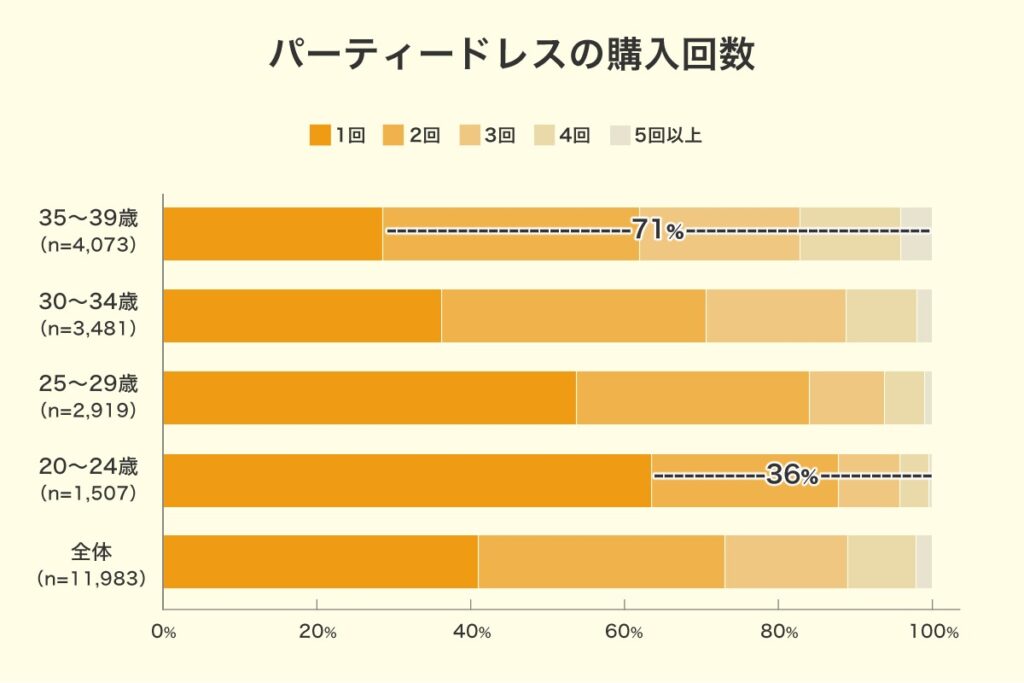 株式会社クロスマーケティングが実施した「パーティードレスの購入回数」の調査では、35〜39歳の女性が購入した回数は、2回以上が70%以上という結果になっています。このことから、将来的にドレスの購入は1回では終わらないということがわかるでしょう。