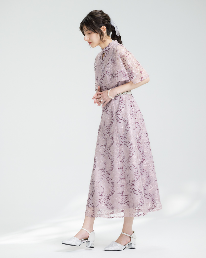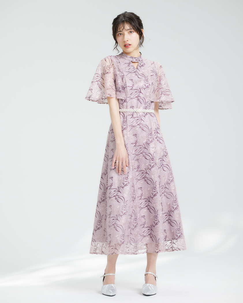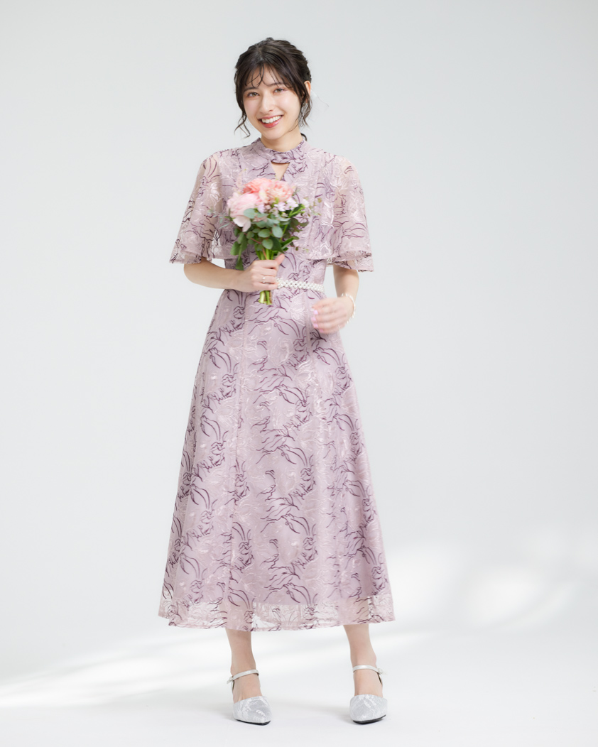 繊細な花柄の配色糸刺繍が目を引くワンピース。ワンピースは分量たっぷりなフレアシルエットになっております。首元のカットアウトデザインが抜け感を演出。ケープ風の袖口はゆったりとしているので気になる二の腕をカバーします。ショルダー部分まで裏地がついているのでインナーが透ける心配はございません!結婚式や二次会、披露宴のお呼ばれなどにぴったりなデザインです。成人式・謝恩会・同窓会などにもおすすめです。