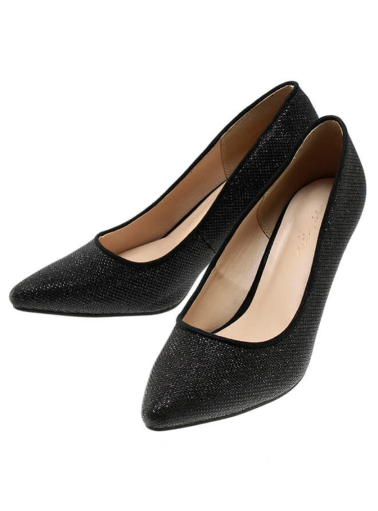 シンプルで合わせやすいラメ地のポインテッドトゥハイヒールです。細かなラメを織り込んだ上品な素材が、歩くたびにきらめいて見え、華やかな足元を演出します。カラーはシルバー・ブラック・ベージュの三色あり、ドレスカラーに合わせて選択できます。