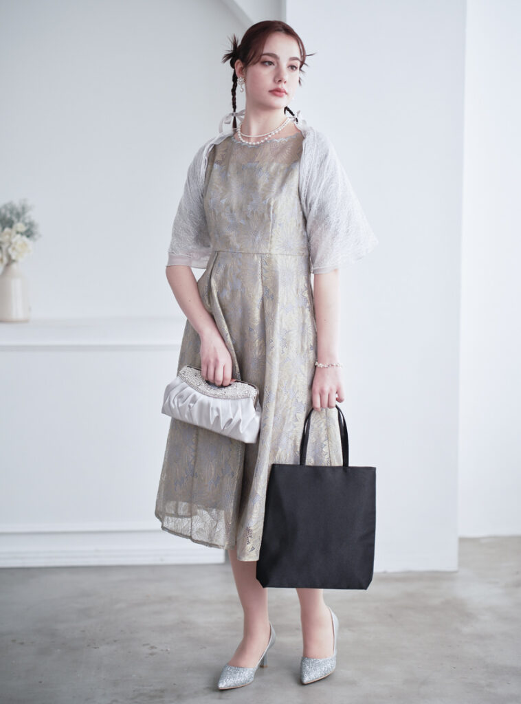 ドレスとシューズ、バッグ、アクセサリー3点、羽織、さらにサブバッグの計8点がセットになっています。ドレスはゴールドの刺繍レースがエレガントなフレアワンピースです。ドレスはイエロー・ブルーグレー・ミント・ピンクの4色の中から選択できます。