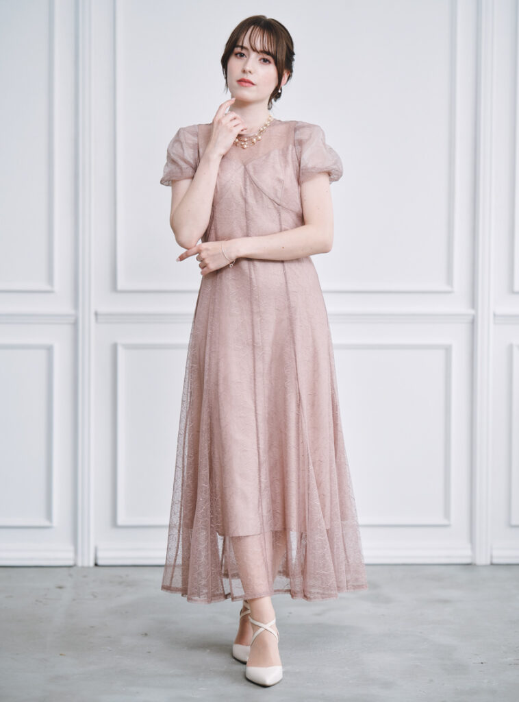 パフスリーブと肩周りの透け感がポイントのレースワンピースドレスです。高めに設定されたウエストの切り替えによって、スタイルアップ効果を演出します。後ろ身頃の首元にはくるみボタンがあしらわれているので、アップスタイルの髪型と合わせるのもおすすめです。