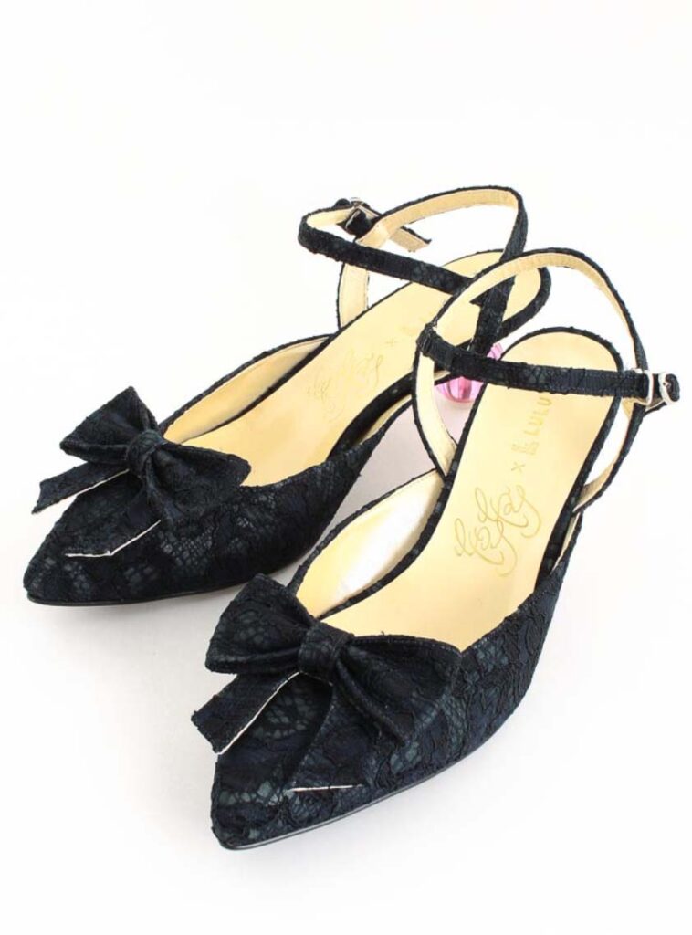 フロントの大きめなリボンが目を引くパンプスです。ヒールがパフュームの瓶のような特徴的なデザインで、総レース素材が華やかさを演出してくれます。ローヒールで疲れにくいのも嬉しいポイントです。グレー・ベージュ・ネイビーの3色あるので、ドレスに合わせて選べます。