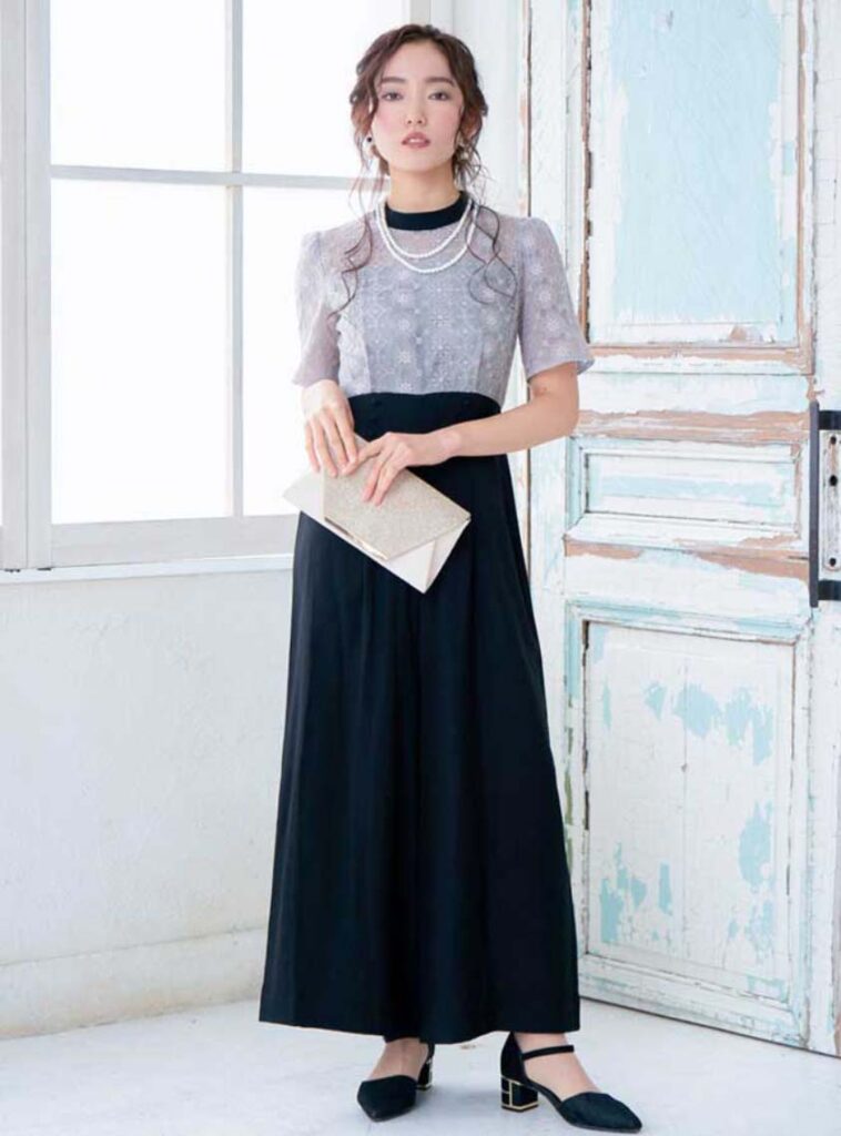 オーガンジーの刺繍がクラシカルで上品なオールインワンドレスです。サテン生地が高級感を、ハイウエストのデザインが脚長効果を演出します。背中ファスナーなので着脱しやすく、締め付けが無いため着用中も快適に過ごせます。落ち着きとかわいらしさを両立した、大人世代におすすめのアイテムです。