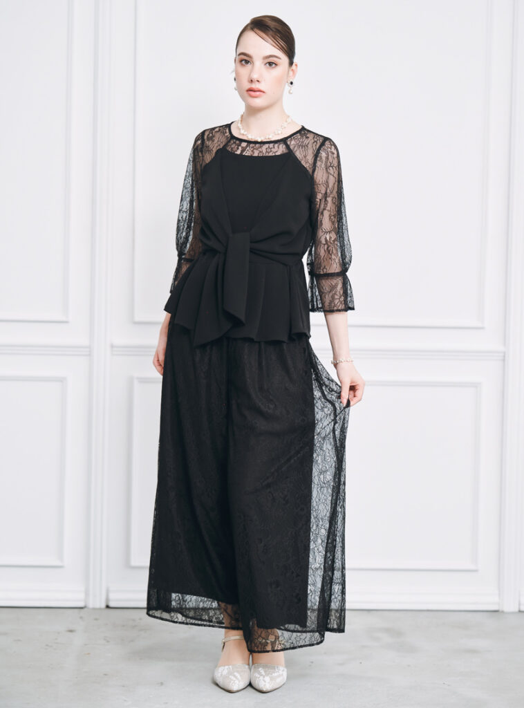 やわらかいシフォンジョーゼットと繊細なフラワーラッセルレースを組み合わせた、ブラウスとパンツの2点セットです。前結びとペプラムのデザインを取り入れたブラウスは、かぶりタイプでゴム仕様のため着脱も簡単です。トップスと同じレース素材を使用したワイドパンツと上下セットで着用することで、華やかなスタイルが完成します。