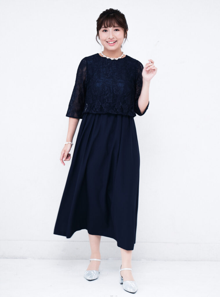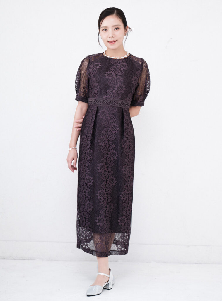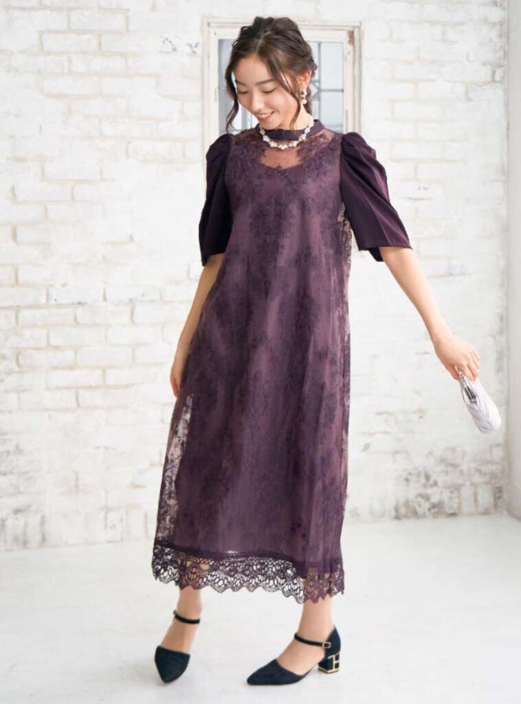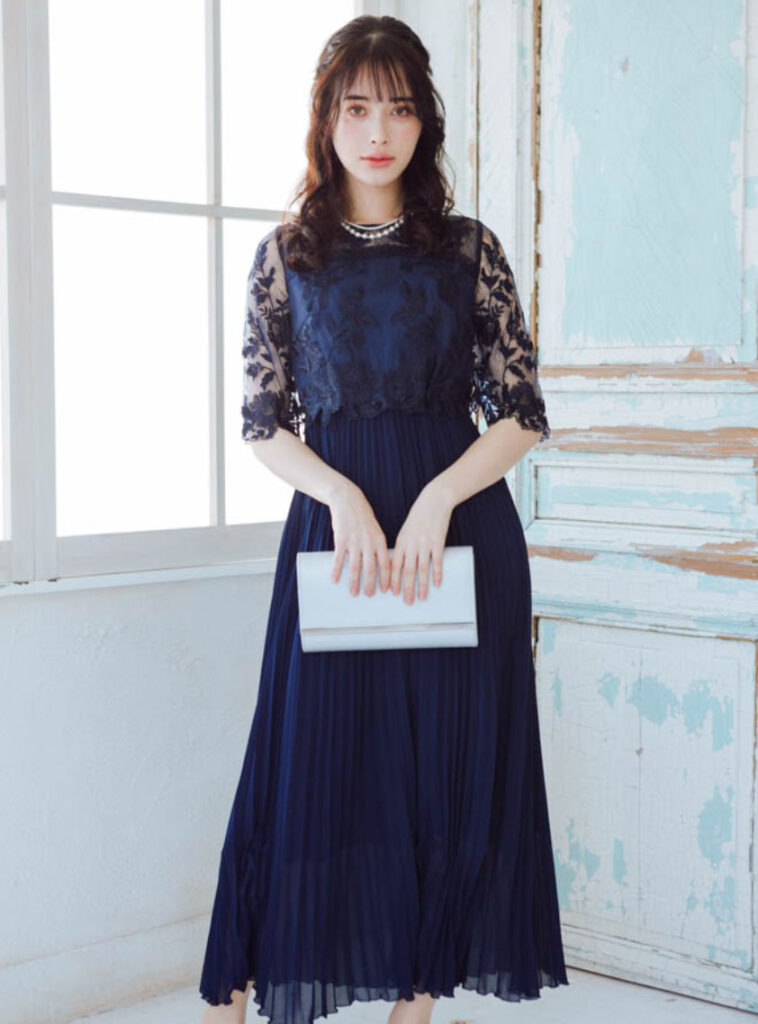 レースとプリーツを組み合わせたロングスカートがエレガントな印象のドレスです。シンプルながら華やかさのあるデザインは、40代の大人の女性によく似合います。高めのウエスト切り替えによって、すっきりとしたシルエットが叶うのもポイントです。