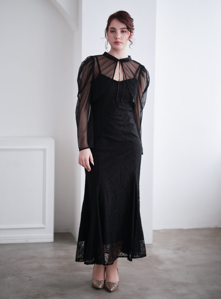 トップスの着方によって、カーディガン風とトップス風の2wayで楽しめるデザインです。優雅で繊細なヴィンテージレースが、ホテルの雰囲気にふさわしい品格を添えてくれます。曲線的なマーメイドシルエットで、ボディラインを美しく見せられるのもポイントです。