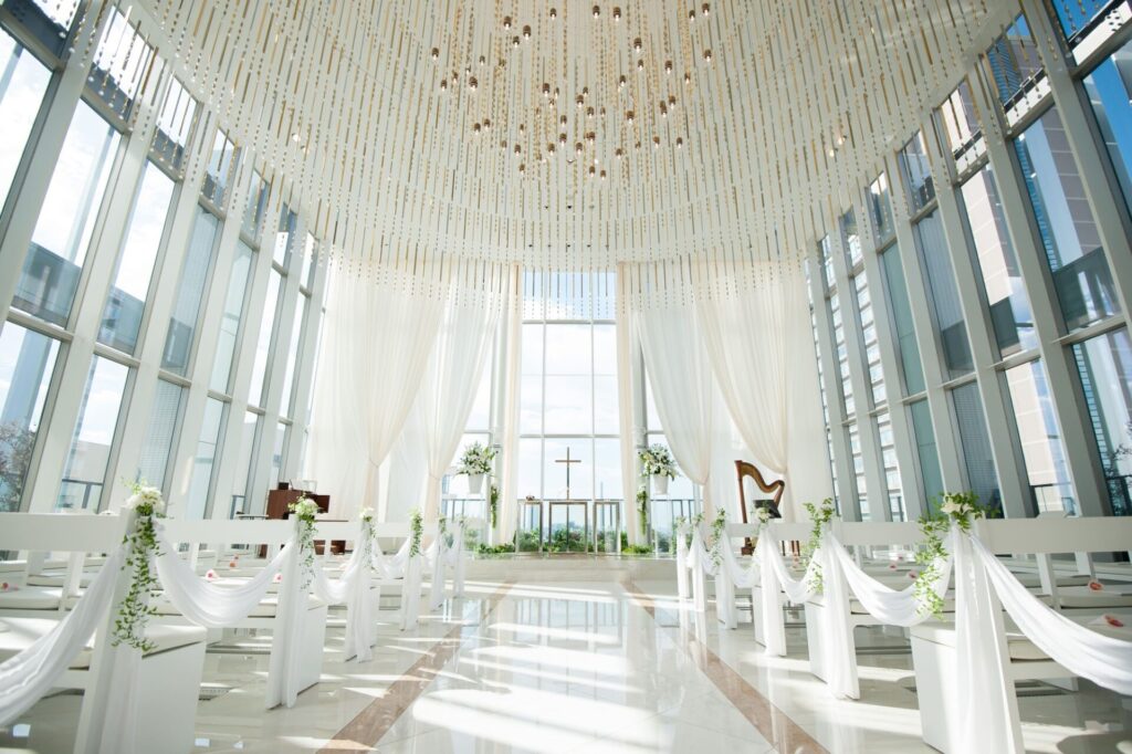 結婚式を挙げるために設計された専門式場は、華やかで祝祭感があるのが特徴です。チャペルや披露宴会場は豪華な雰囲気で統一されているため、華やかさと品のよさのバランスを意識した装いでまとめましょう。