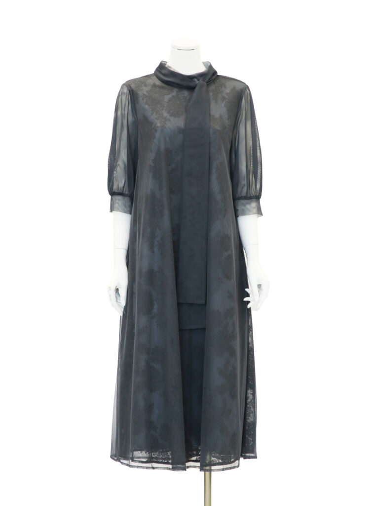繊細な刺繍チュールレースを使用したAラインのドレスです。刺繍が透けて見える品のあるデザインが大人の落ち着きを感じさせます。ウエスト部分に締め付けが無く、ゆったり着用できるのがポイントです。首元のリボンの結び方によって、雰囲気の変化を楽しめるでしょう。