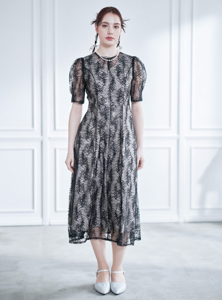 ハリのあるスカートと花柄のレーストップスが、エレガントな雰囲気を演出するドレスです。袖のあるかぶせデザインのトップスは体のラインを拾いにくく、さりげなく体型をカバーします。控えめな透け感とシンプルなシルエットが魅力の清楚なスタイルです。