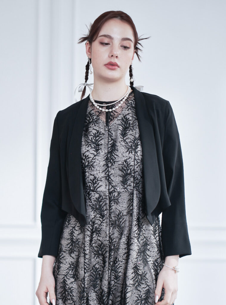 シルエットが美しいコンパクトなジャケットです。ショート丈のため、どのようなドレスとも相性がよく、コーディネートを引き締めてくれます。高級感のある程よいハリ感が品の良さを演出してくれるでしょう。
