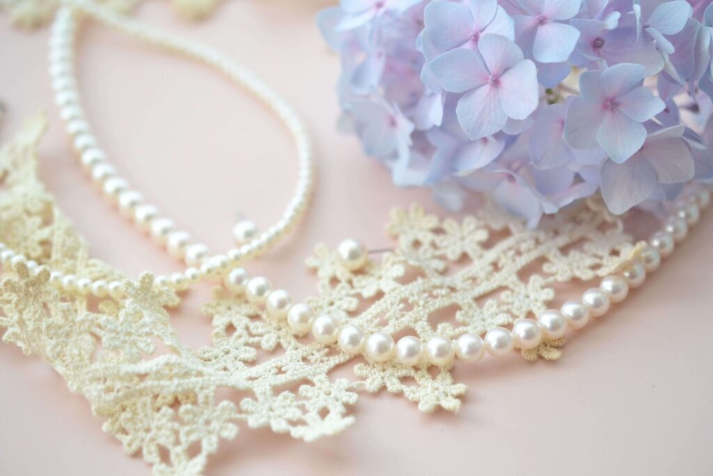 ゴールド系を差し色として取り入れると、温かみのある華やかさが加わり、秋冬の結婚式にもおすすめです。小ぶりのパールは控えめで上品に仕上がるため、ドレスの色やデザインを問わず合わせやすいでしょう。