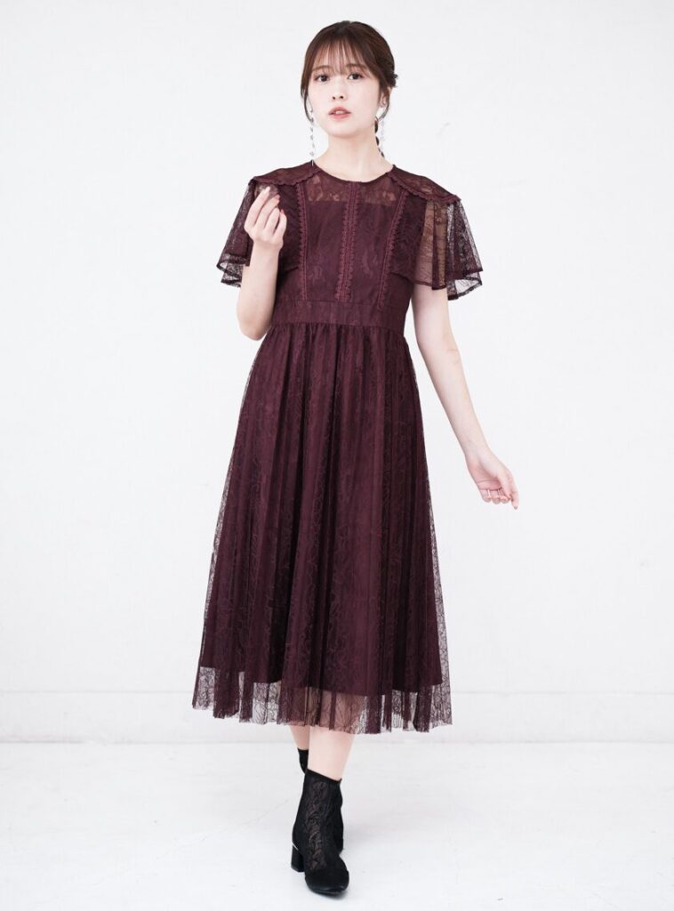 総レースのプリーツスカートが上品に揺れるワンピースドレスです。二の腕をカバーするブロードショルダーとウエスト切り替えで、すっきりとした印象を与えます。結婚式からパーティーまで幅広く活躍する一着です。