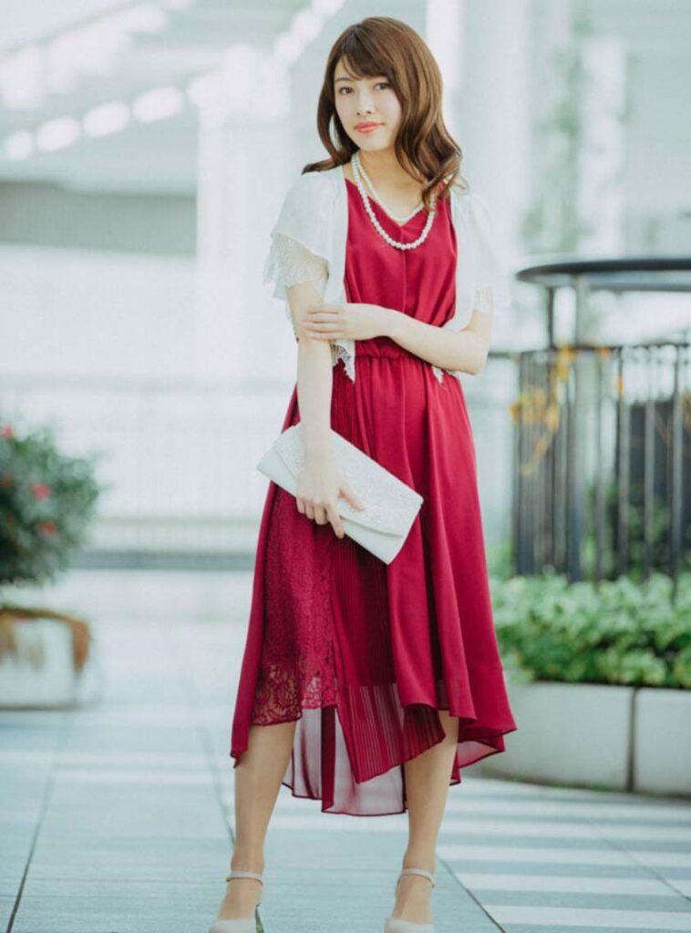 赤いドレスは存在感があるため、アクセサリーは派手すぎず上品なデザインを選ぶのがポイントです。