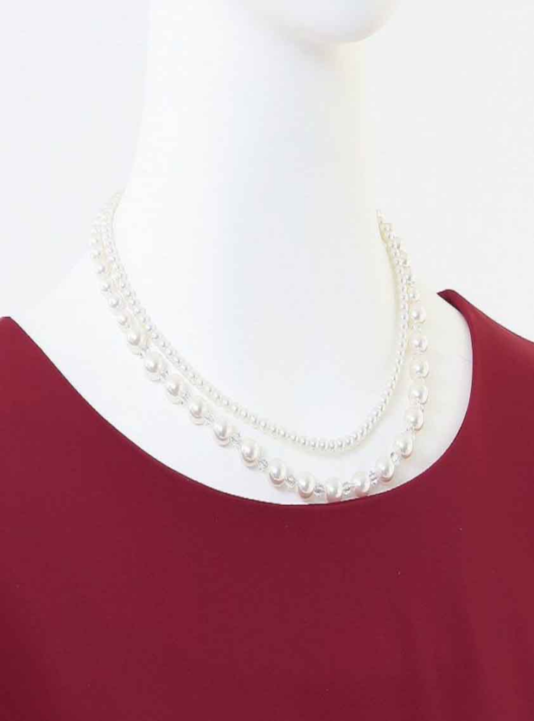 シンプルで上品な2連パールネックレスは、さまざまなシーンで活躍する万能アイテムです。華やかさをプラスしつつ上品さを保てるため、結婚式で着る赤いドレスとのコーディネートにピッタリです。