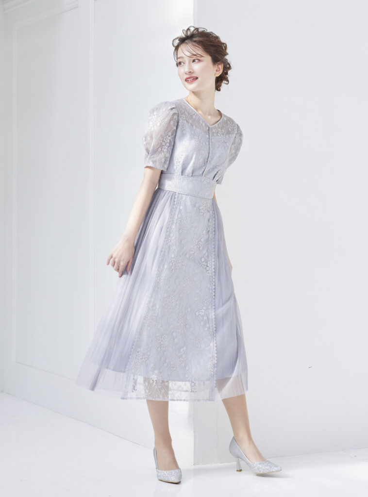 レースとプリーツを取り入れた華やかなワンピースドレスです。動くたびにスカートが揺れ、エレガントな雰囲気を演出します。ウエストは高めで切り替えられているため、シルエットをきれいに見せられます。