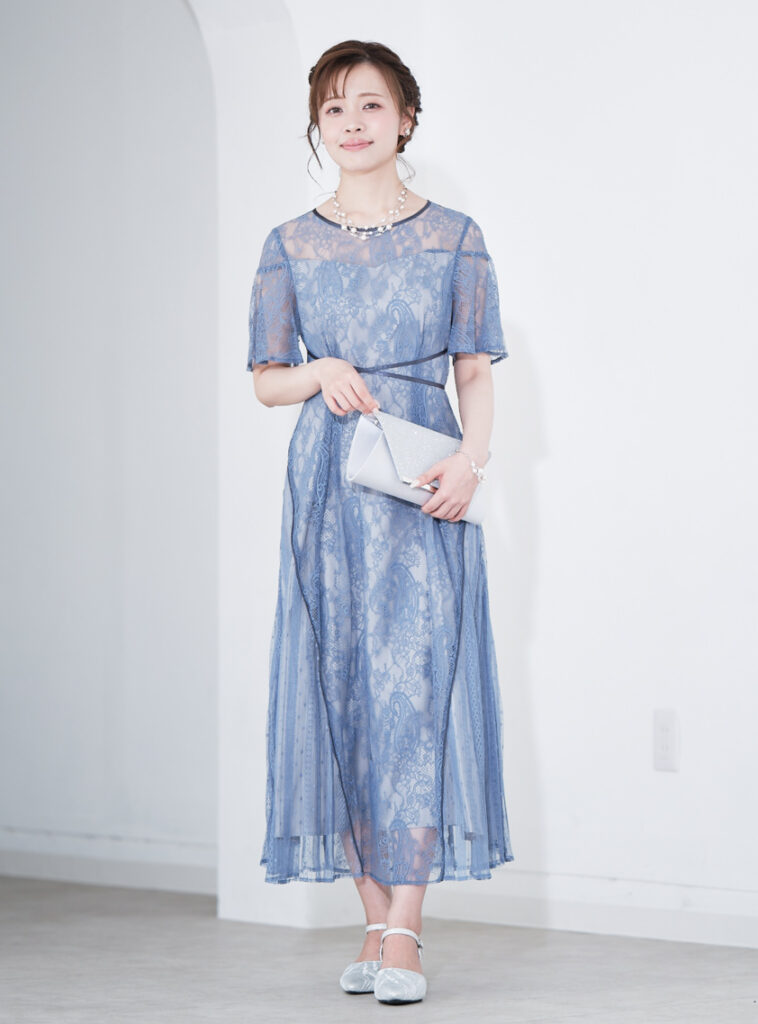エレガントなペイズリー柄のレース素材を使用したワンピースドレスです。レースとインナーのコントラストがおしゃれな印象を与えます。ブルーの爽やかな色合いが、夏にぴったりな一着です。