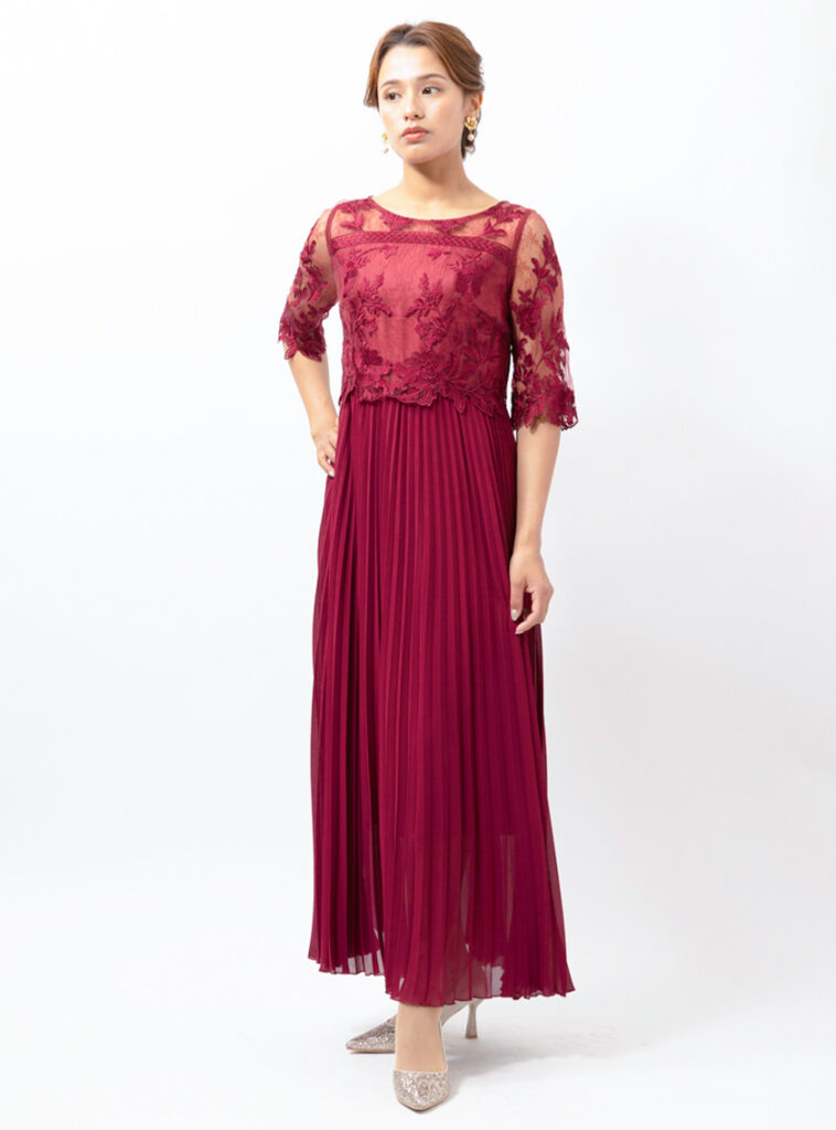 透明感のある刺繍がデコルテラインをきれいに見せるワンピースドレスです。シフォン素材のプリーツスカートが揺れて、エレガントな雰囲気を演出します。繊細なデザインが50代の上品さを引き立てる一着です。