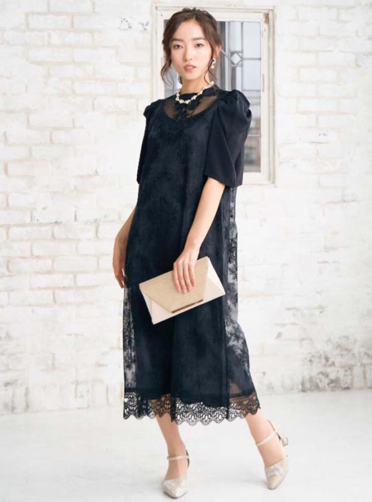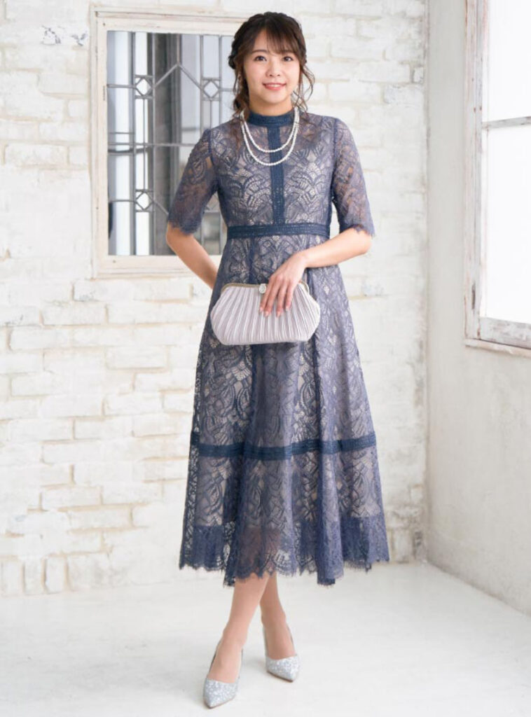 ドレープ袖が華やかさと上品さを感じさせるレース素材のワンピースドレスです。ヴィンテージ加工がされたレースと深みのあるカラーが40代の優雅さを引き立てます。ウエストはゆったりとしているため、ストレスなく着られます。