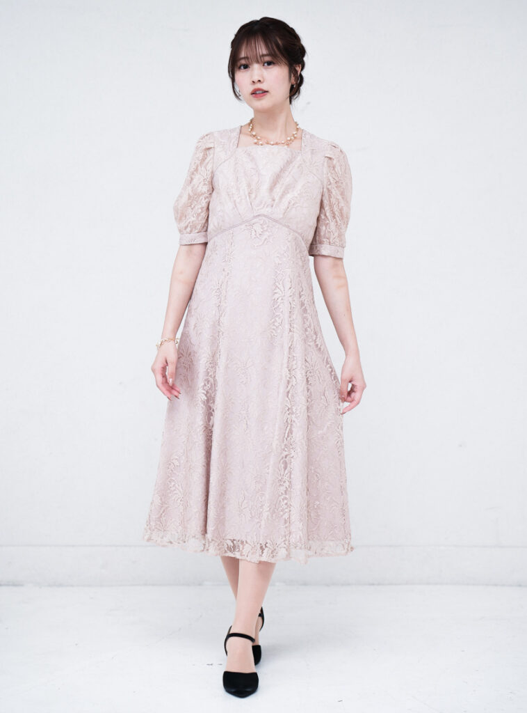 総レースのデザインと花柄の刺繍が華やかなワンピースドレスです。スクエアネックがデコルテをきれいに見せます。程よい透け感が春らしいやわらかさを感じさせる一着です。