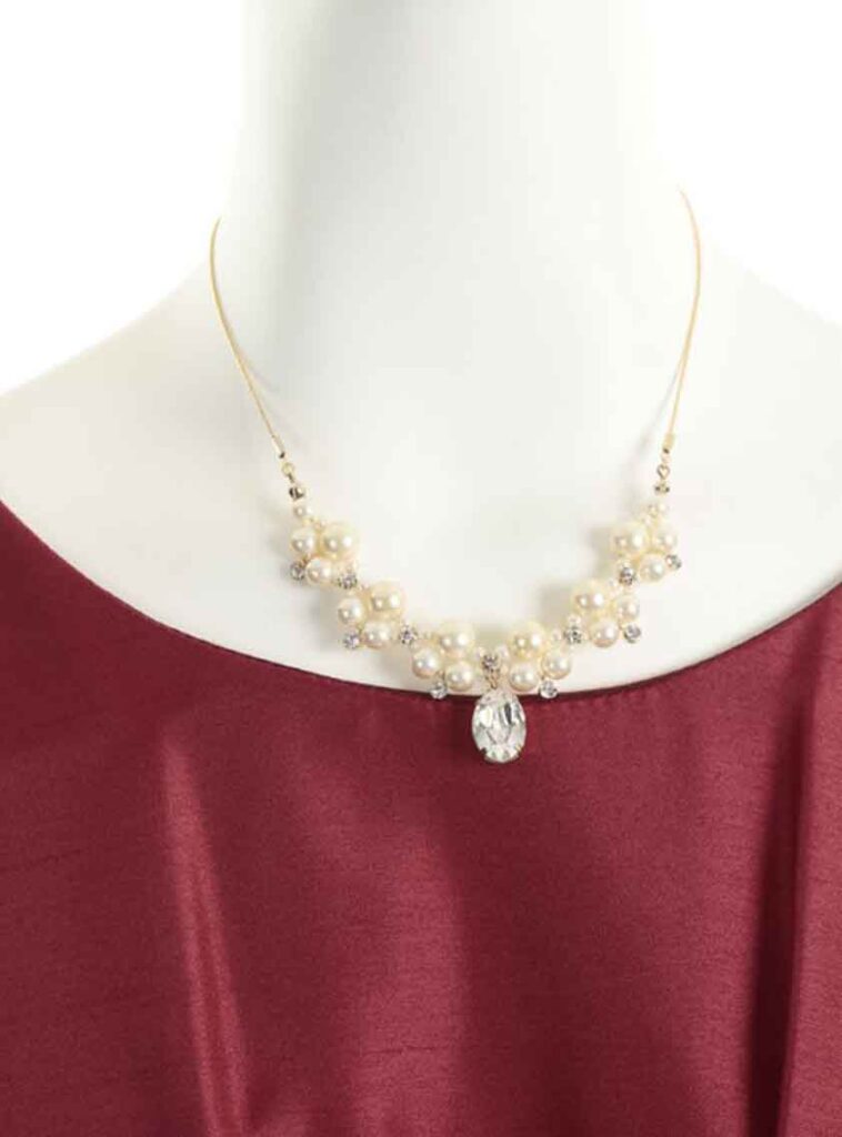 パールとダイヤビジューが首回りを華やかに見せるネックレスです。中心に付いた大きなダイヤのビジューが高級感を演出します。エレガントなデザインは、ディナーショーの雰囲気に調和します。