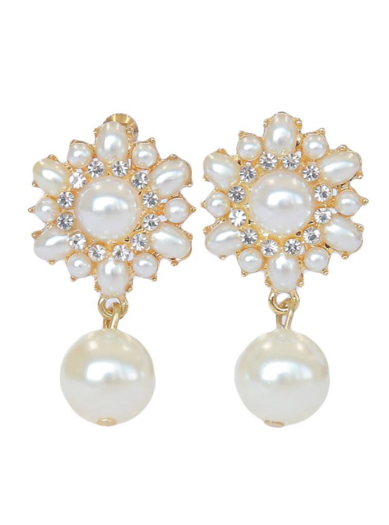 パールとラインストーンで飾られた花形のイヤリングです。動くたびに揺れるパールがエレガントな印象を与えます。光を反射してきらめくデザインが、ディナーショーにふさわしい華やかさを演出します。