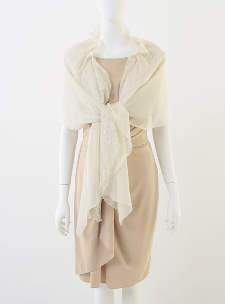 レースシフォンの柔らかな素材が春らしさを演出できるショールです。着こなし方は自由で、前結びでも、肩にかけるだけでもおしゃれなコーデになります。シンプルなデザインなので、ワンピース・パンツドレスどちらにも合わせられます。