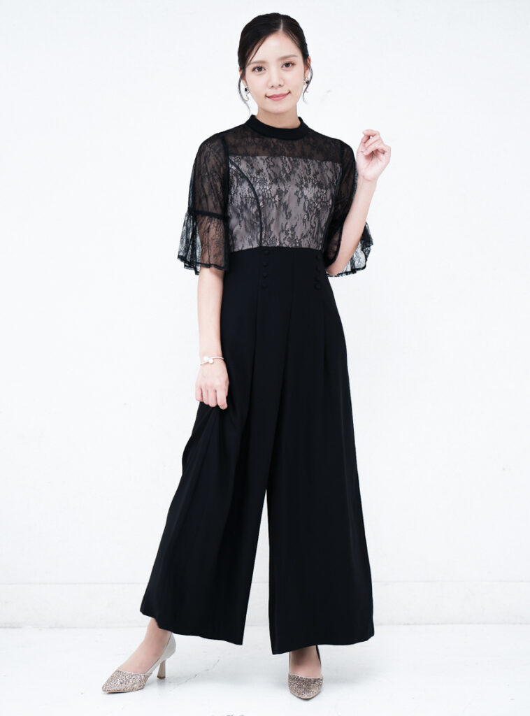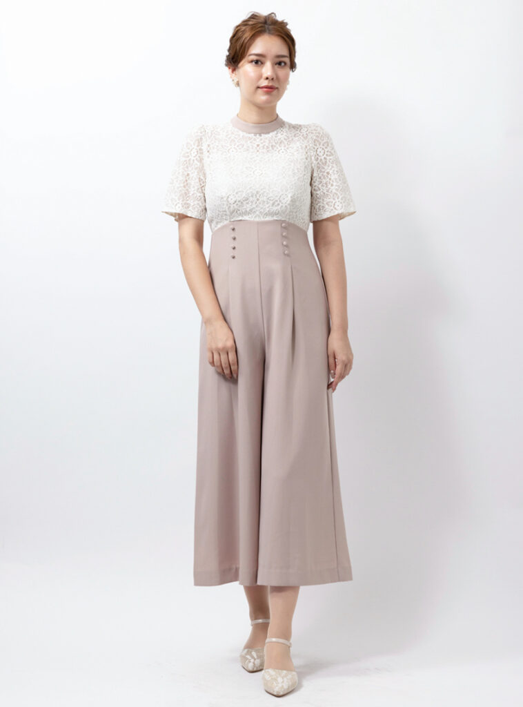 トップスとパンツがセパレートになっているパンツドレスです。レースとジョーゼットの組み合わせは、大人っぽく上品な印象を与えてくれます。ウエスト部分を絞ったペプラムデザインは、程よくお腹周りをカバーできます。