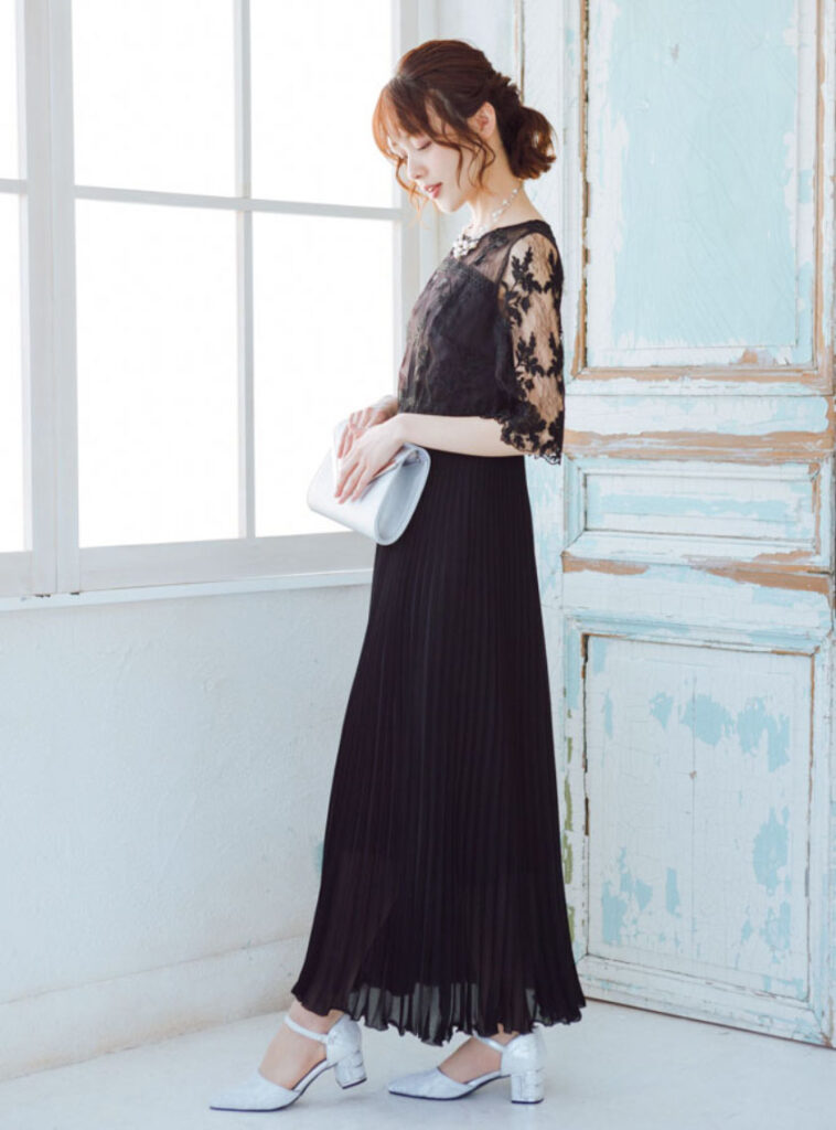 デコルテ周りを綺麗に魅せてくれる、ラウンドネックのロングドレスです。袖のレース部分は、腕周りを程よくカバーしてくれます。プリーツ加工されたスカートが動くたびに揺れて、エレガントな雰囲気を演出します。