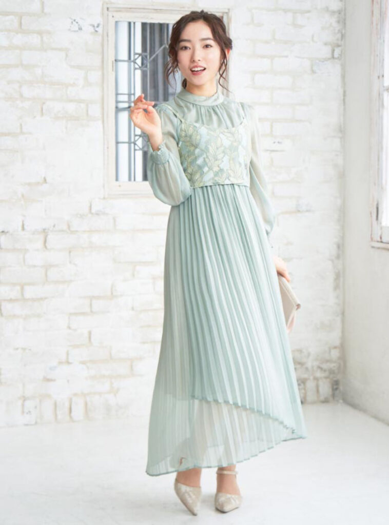 ミントカラーの爽やかな色合いが華やかなドレスです。プリーツ加工されたスカートは、足を長く見せてくれてスタイルアップ効果もあります。ビスチェは取り外し可能で、結婚式・二次会でスタイルチェンジしたい方におすすめです。