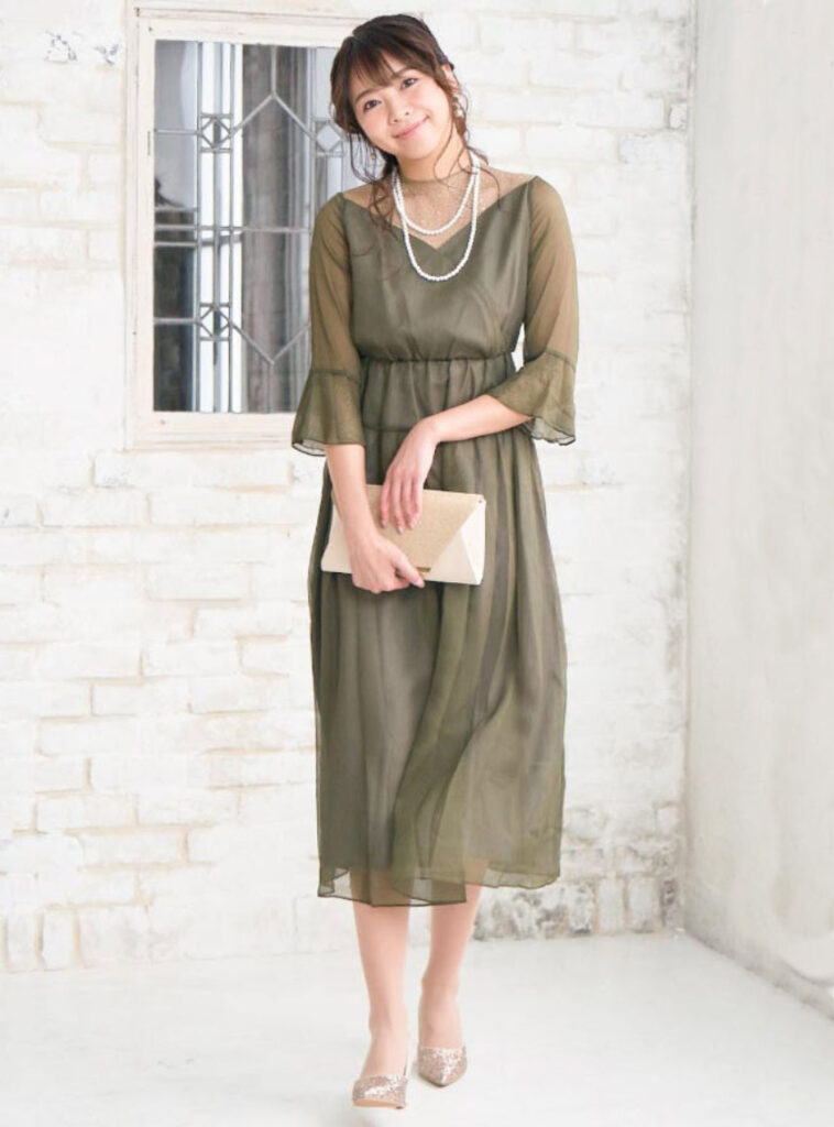 デコルテを美しく魅せてくれる、カシュクールデザインのドレスです。落ち着いたカーキは、秋らしい雰囲気を演出します。シフォン素材にラメが施されていて、華美すぎない上品さがパーティーシーンにぴったりです。