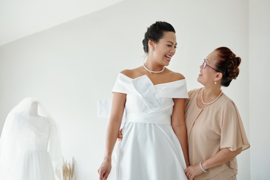 結婚式で母親が洋装を着用する際は、裾が長めのロングドレスを選ぶのが一般的です。ただし、ガーデンウェディングでは裾が床に付くと汚れる可能性があるため、くるぶし程度の丈を選んでも問題ありません。
