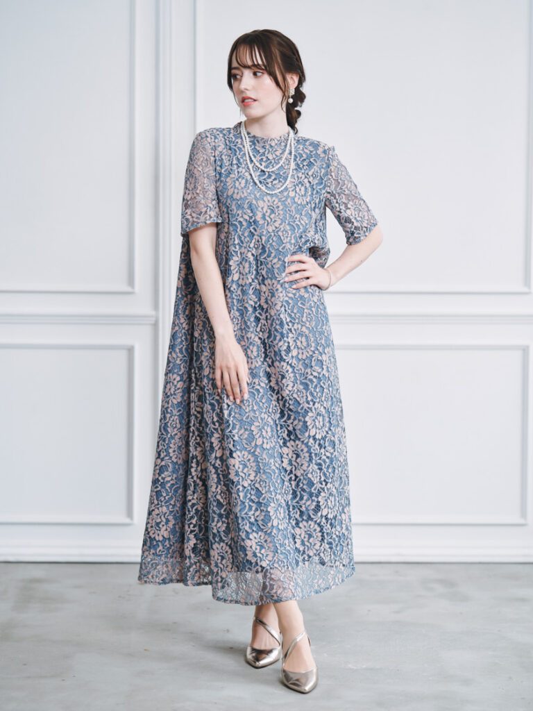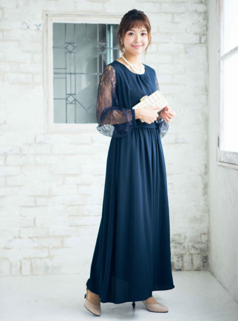 袖部分にレース素材を使ったロングドレスです。柔らかな手触りのジョーゼットはドレープが美しく、優雅な印象を与えてくれます。床に付かない程度の丈感なので、汚れを気にせず快適に歩けます。