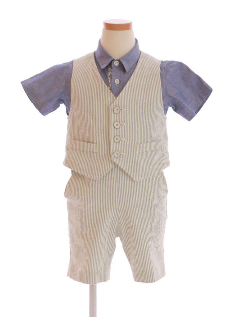 ベスト・ワイシャツ・パンツの3点が揃った男の子用スーツです。ストライプのベストとパンツで、爽やかな雰囲気を演出します。ワイシャツの前立てには花柄がデザインされていて、おしゃれな着こなしを楽しめます。