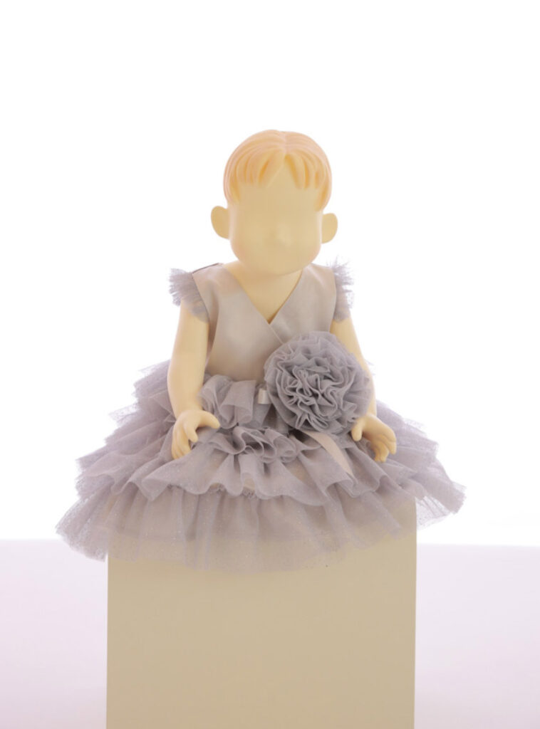 たっぷりのフリルを使った可愛らしいベビードレスです。お花モチーフのコサージュが印象的です。サテン生地にラメが施されていて、煌びやかな雰囲気を演出します。小物はペールトーンで揃えると統一感が出ておしゃれです。