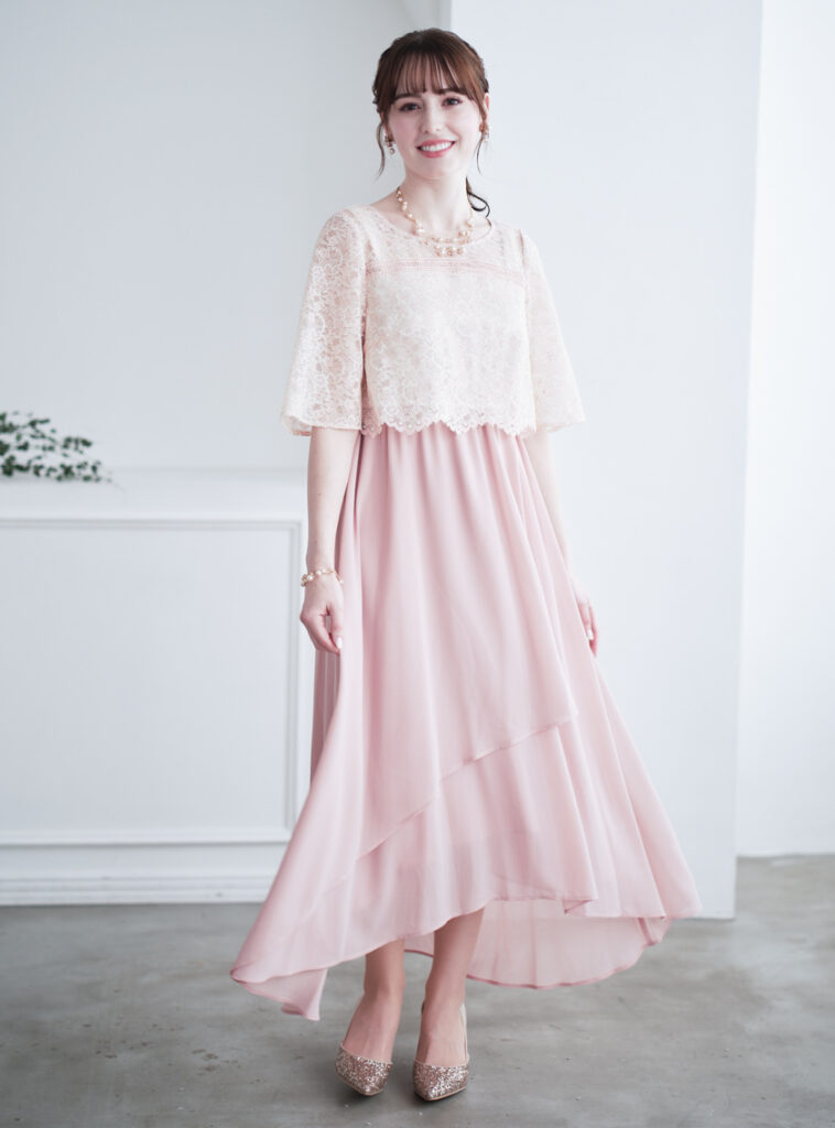 パステルピンクの淡い色合いが春らしいルルティオリジナルドレスです。裾の揺れ感が美しいフィッシュテールのスカートは、フェミニンを演出してくれます。トップスは5分丈で、腕周りを程よくカバーできます。