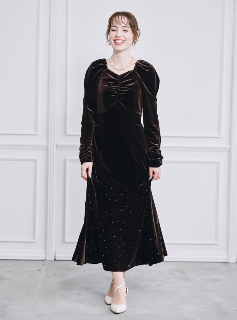 光沢感のあるベロア生地を使用したロングスリーブのドレスです。胸元や袖口にあるギャザーデザインは、フェミニンな雰囲気を演出します。スカート部分にはストーンが施されていて、キラキラとした輝きがパーティーシーンにぴったりの1着です。