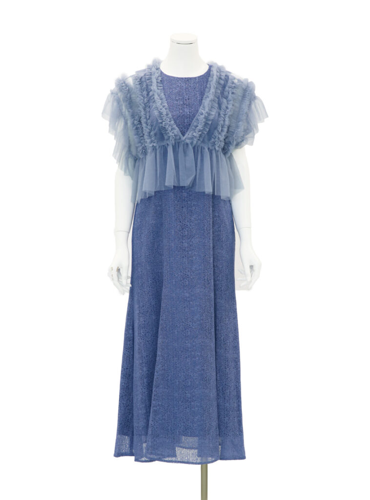 スレンダーシルエットが美しい、2wayの着こなしを楽しめるドレスです。ワンピースは前後着用が可能で、シーンに合わせてVネックとラウンドネックの着こなしを選べます。透け感を抑えたレース素材は、冬の季節にもぴったりの1着です。