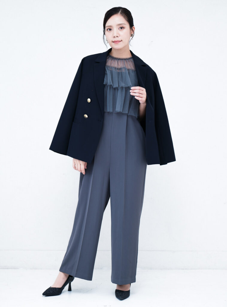 チュールブラウスとキャミソールのオールインワンがセットになったパンツドレスです。ギャザーフリルのデザイン性のあるトップスは、華やかさを演出します。センタープレスされたパンツは上品見えできるだけでなく、縦ラインを強調できるため足長効果も抜群です。