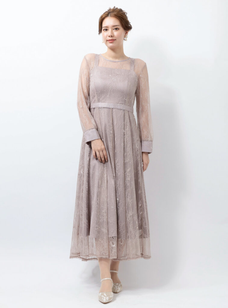 全身レースが上品な印象のロングスリーブドレスです。肌馴染みのよいピンクベージュは、フェミニンな雰囲気を演出できます。インナーワンピースとアウターワンピースは別々に着用可能で、2wayの着こなしを楽しめる1着です。