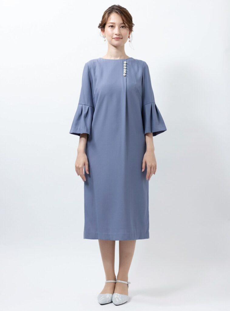 アイスブルーが春夏らしいAラインのワンピースです。胸元にパールが施されていてアクセサリーがなくてもコーディネートが仕上がります。袖が七分丈なので二の腕が隠れるのも嬉しいポイントです。