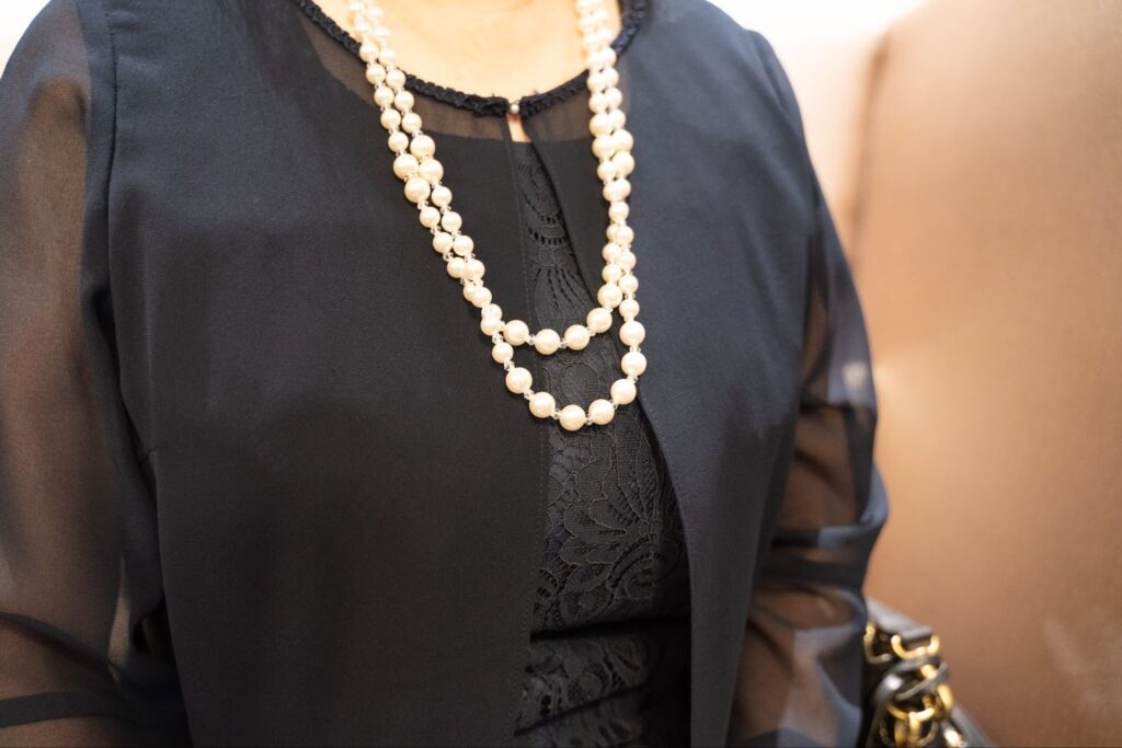 黒やネイビーのセットアップには、パールのネックレスやダイヤのイヤリングを合わせると華やかさを取り入れられます。シンプルなワンピースには、ゴールドやシルバーなどのシックな鞄をもつとコーディネートが引き締まるでしょう。