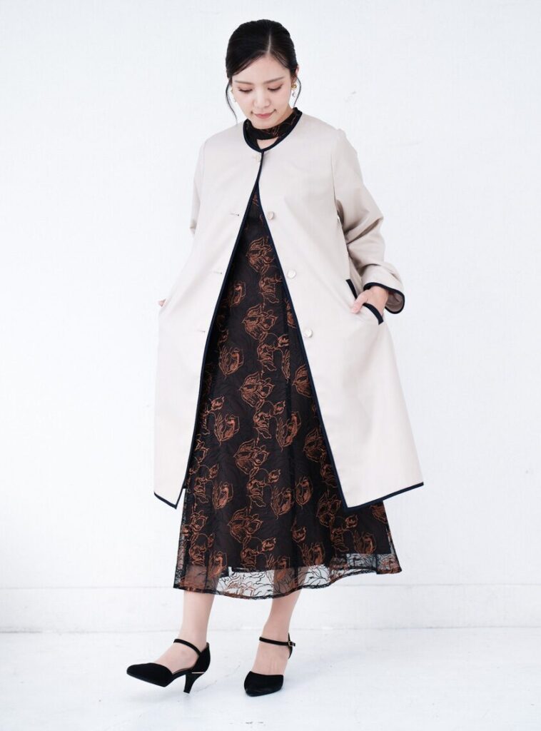 白色が上品な雰囲気のノーカラーコートです。黒色のバイピングがアクセントになって程よく個性を演出してくれています。ポケットが大きいのでスマートフォンや財布が入って便利です。