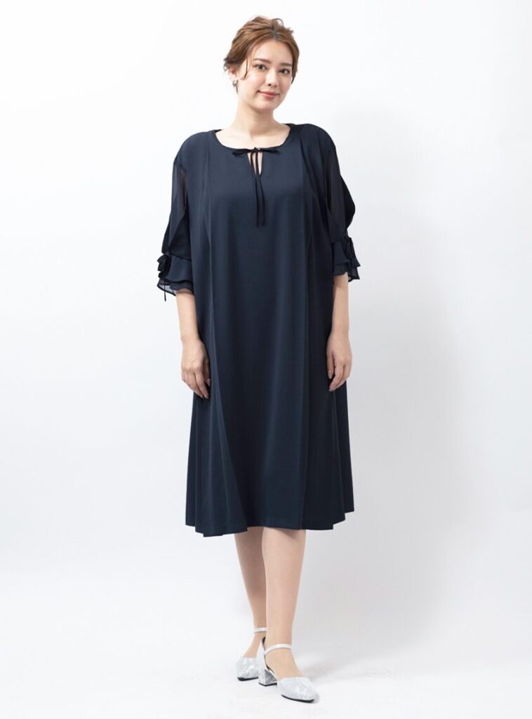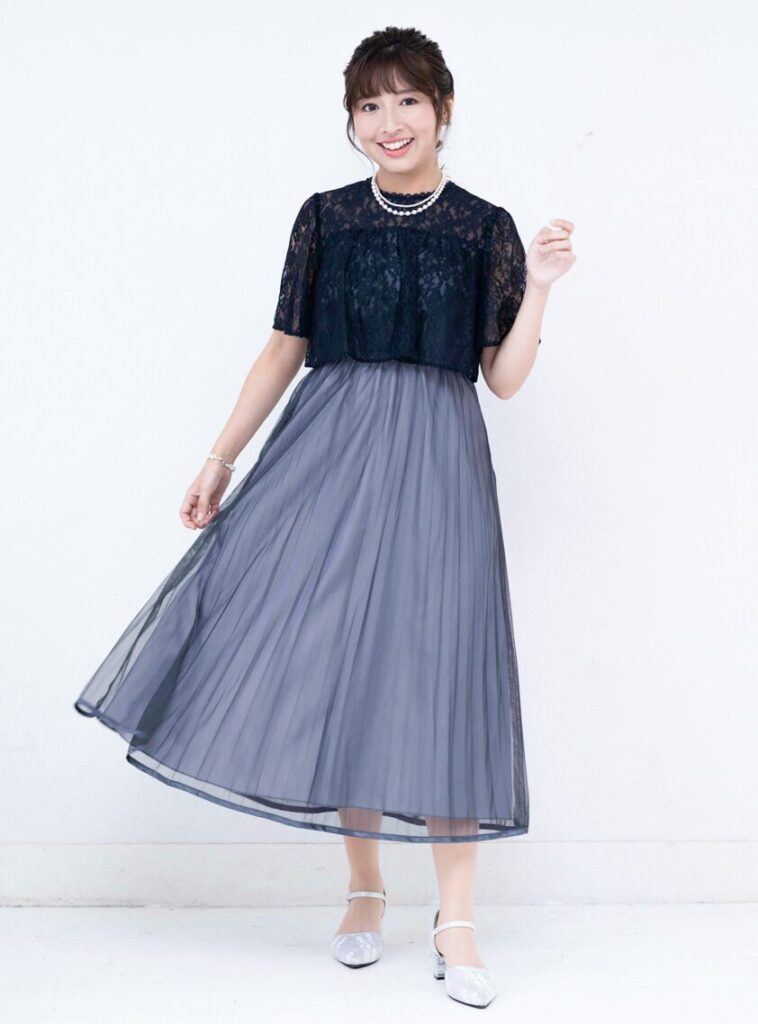 トップスのレースとスカートのチュール素材が華やかなワンピースです。ネイビーの色味が絶妙で、マナーを守りつつお洒落を楽しめます。首元のスカラップやスカートの裾のパイピングなど細部までこだわりを感じます。