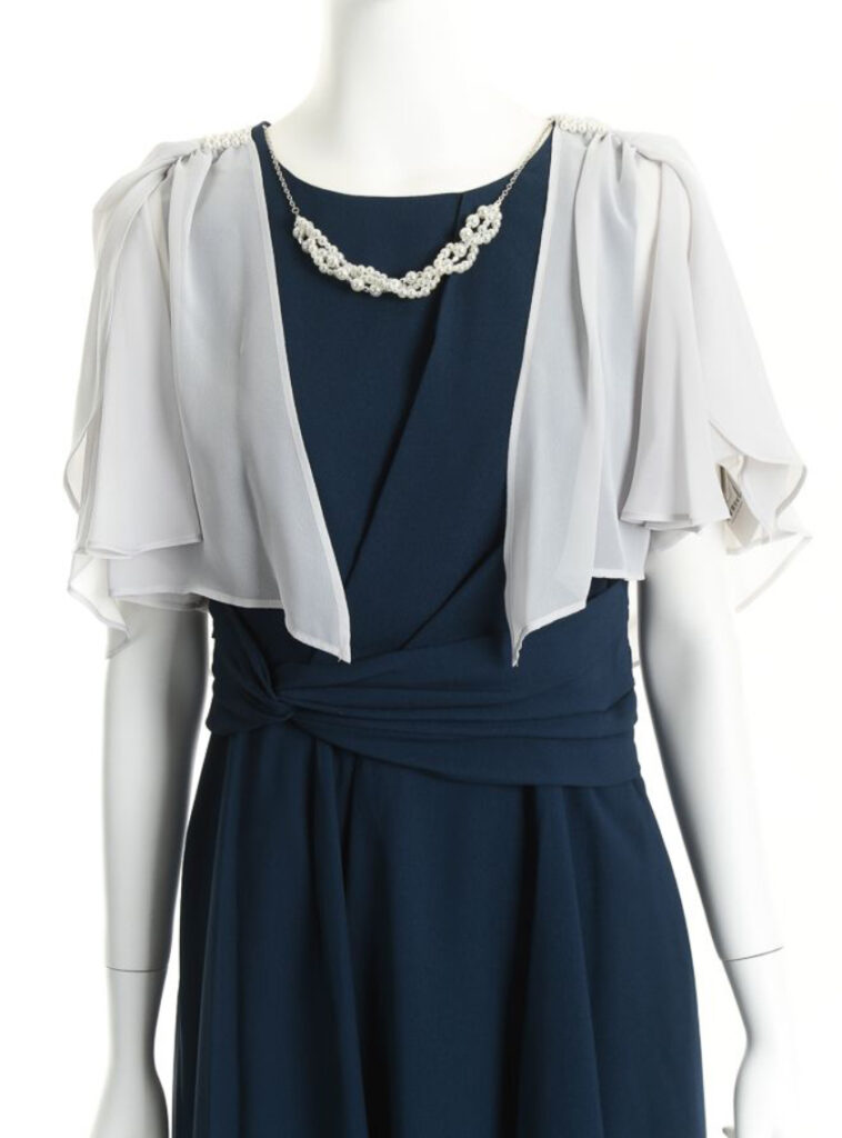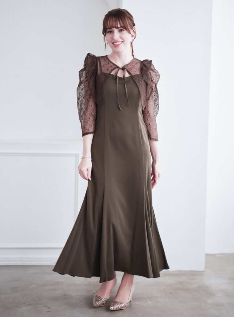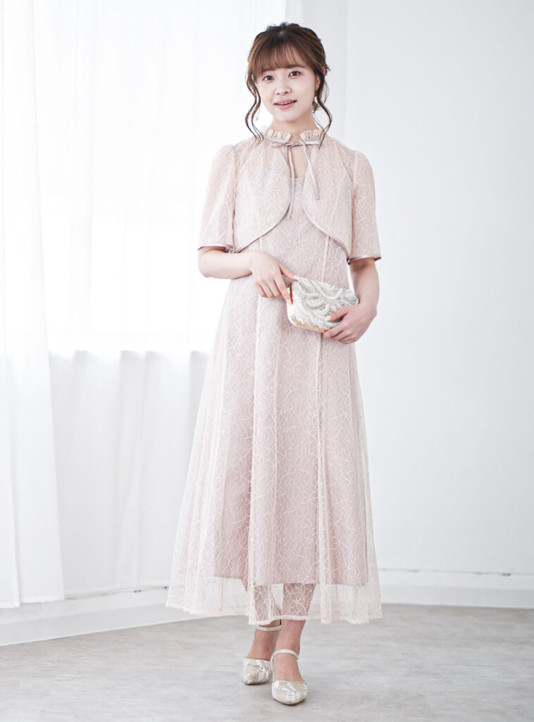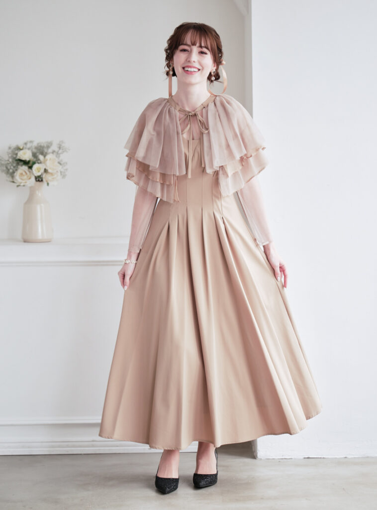 ボレロ・ケープ・ドレスの3点がセットでレンタルできるパーティードレスです。フリルケープのボリューム感が華やかな雰囲気を演出します。ボレロはシアー素材の長袖デザインで、上から羽織るだけでなく、インナーとしても着用できます。