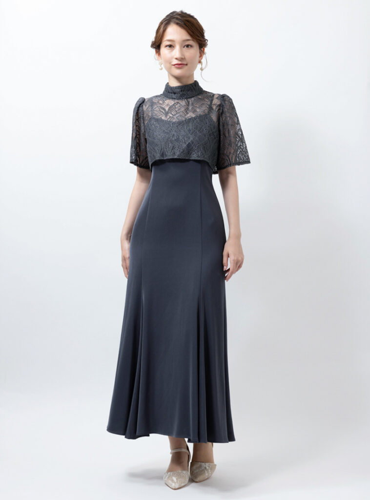 タートルネックのボレロがセットでレンタルできるパーティードレスです。レースの上品な透け感は、顔周りを明るく演出します。ボレロは前後着用だけでなく、インナーとして着用することも可能で、3wayの着こなしを満喫できます。