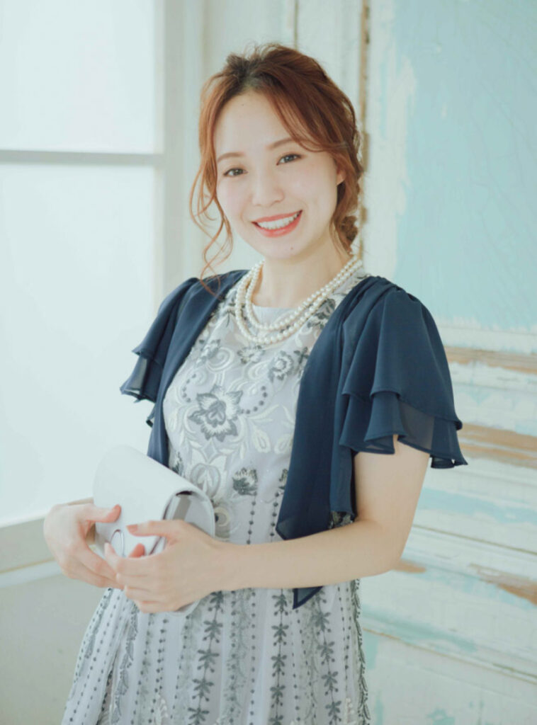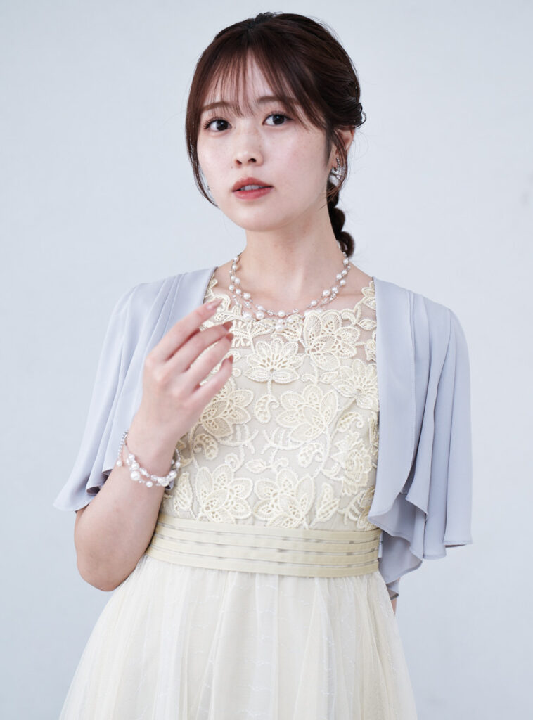 パーティードレスにボレロを合わせる際は、ドレスのウエストラインと着丈が同じものを選ぶのもおすすめです。ドレスのシルエットを崩さず、全体のバランスが整えられてスタイルよく見えます。