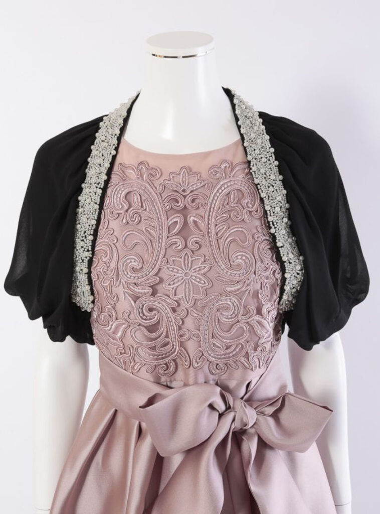 白のビジューで縁取りされたデザインが魅力的なボレロです。シャーリングによる立体感は、フェミニンな雰囲気を演出します。ブラック・ピンクの2色展開で、淡い色のドレスにはブラック、深い色のドレスにはピンクを合わせるのがおすすめです。